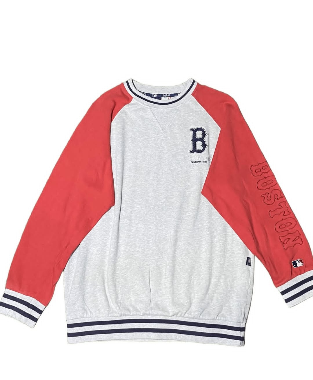 * Detail Grafis: * Terdapat logo huruf “B” khas Boston Red Sox di dada kiri dengan tulisan “Fenway Park” di bawahnya.
